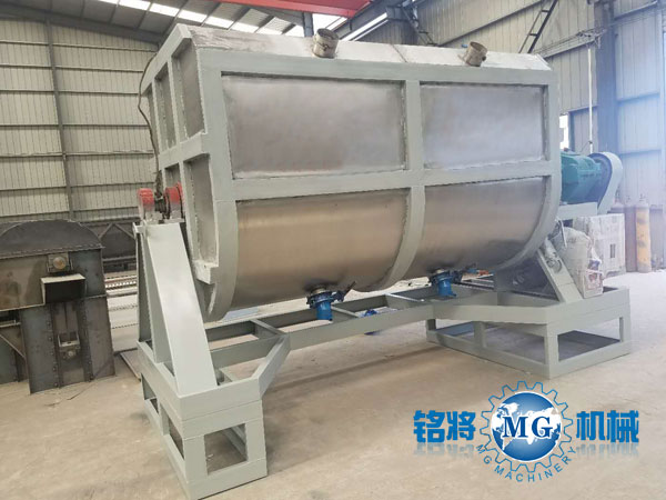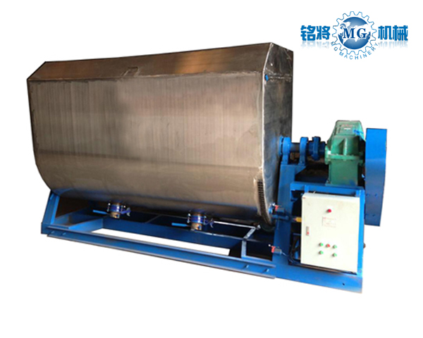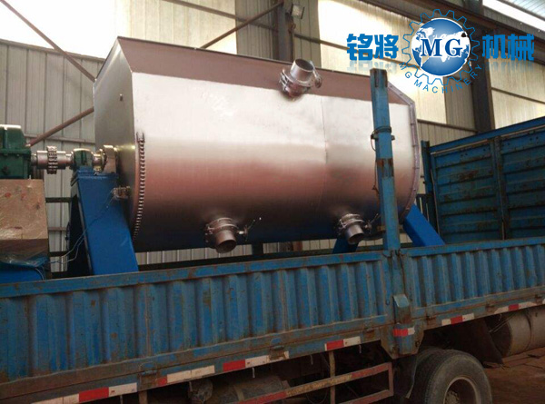 本產品采用U型外觀設計,內部采用雙層螺帶設計。即在水平的主軸上裝有兩條或多條輸送能力相同,螺徑不同,螺轉方向不同的螺帶。通常是當主軸轉動時,一條螺帶把物料從左至右輸送,另一條螺帶把物料從右至左輸送。因而在機內發生對流穿插混合作用,達到混合均勻的目的。